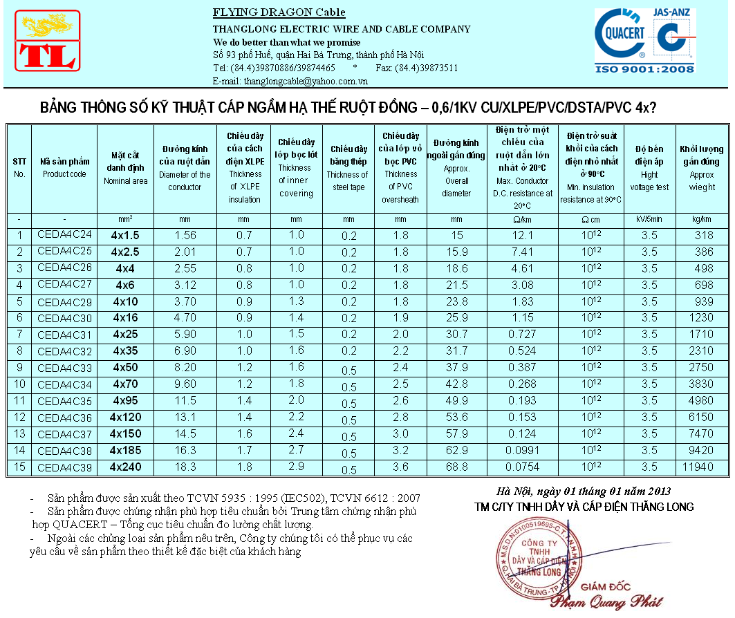 Cáp ngầm hạ thế 0,6/1kV - 4 ruột (loại 4 ruột đều)